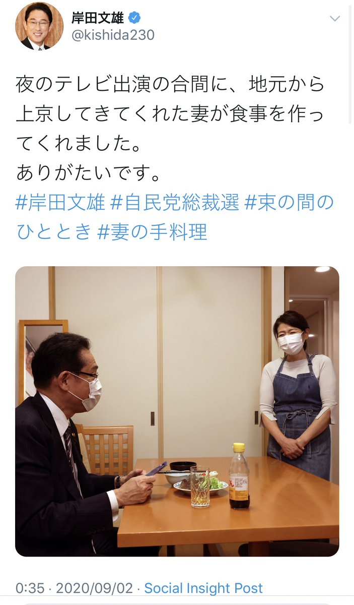 普段は息子二人と家事を分担しながら生活している岸田文雄政調会長 久しぶりに上京してきた妻が食事を作ってくれたことに感謝するツイートをして怒られる Togetter